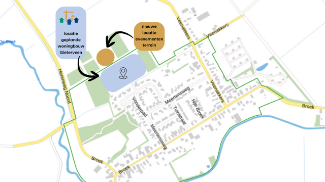 - Het open gebied ten noordwesten van het plangebied voor de woningen krijgt deels een nieuwe functie als evenemententerrein.